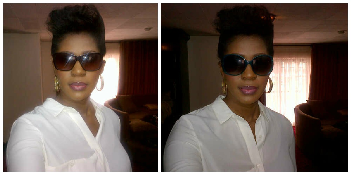 Different sunglasses,earrings,a lighter nd darker pix, same background buh different shot u can also judge by d sofa behind.